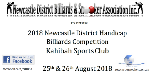 The NDBSA are pleased to announce the 2018 Billiards Handicap Tournament to be held on the weekend of the 25th and 26th of August. This tournament will again be held at the Kahibah Sport Club. Flyer can be downloaded from here.
